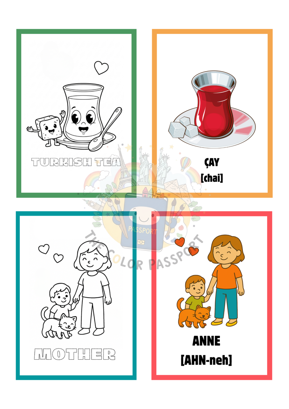 This printable coloring & flashcard book invites toddlers (ages 0–3) on a joyful journey into Turkish culture.