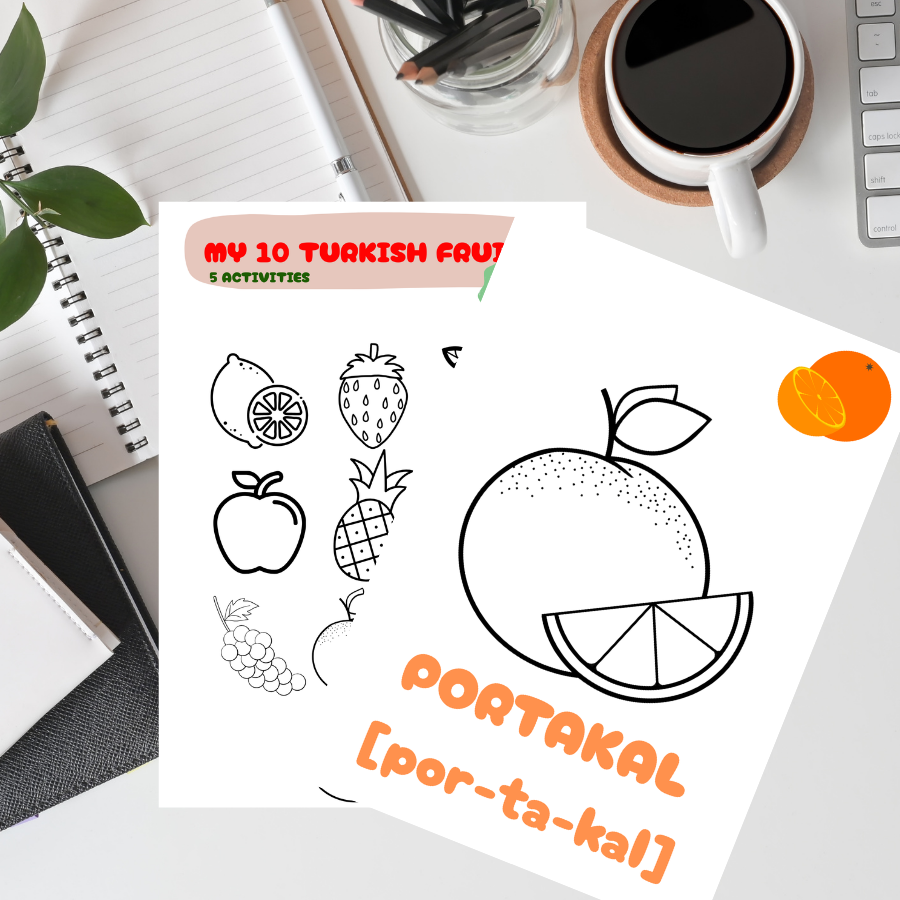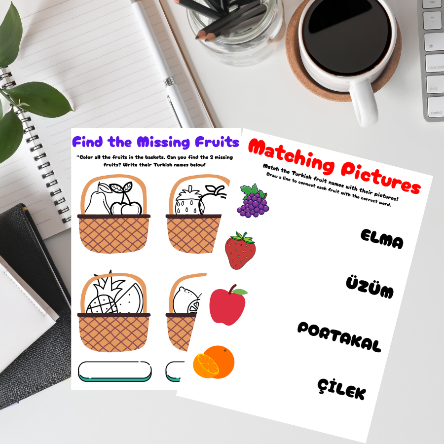 Learn Turkish Fruits for Kids | Printable Activity Book | Turkish Flashcards, Coloring & Matching Games