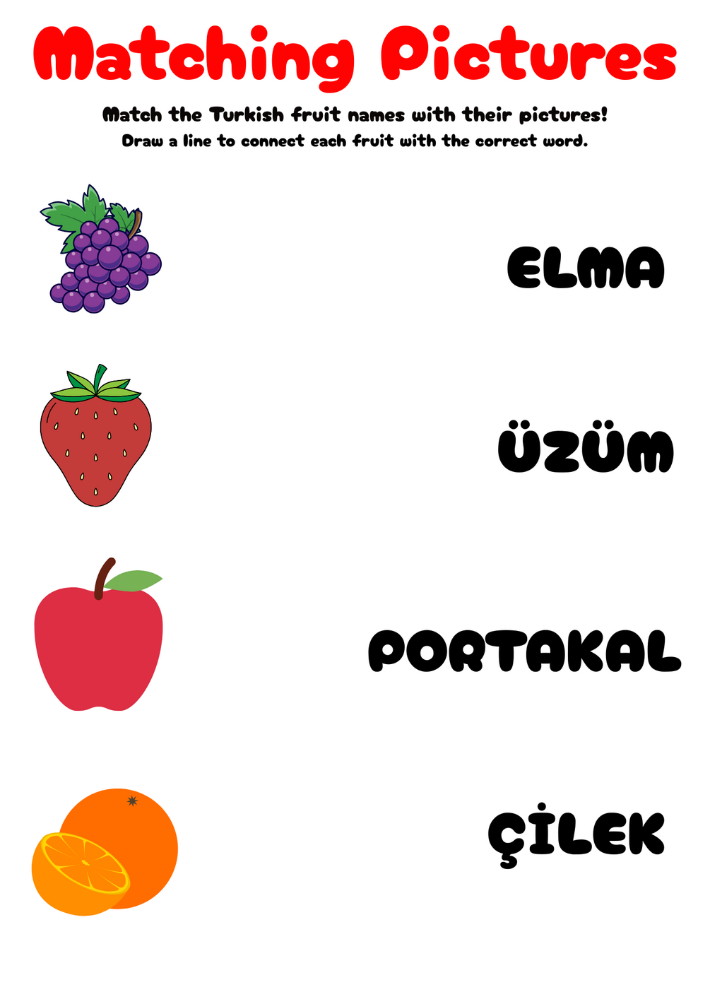 Matching Pictures: An activity to connect the fruit pictures with their correct Turkish names.